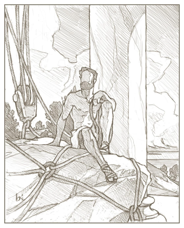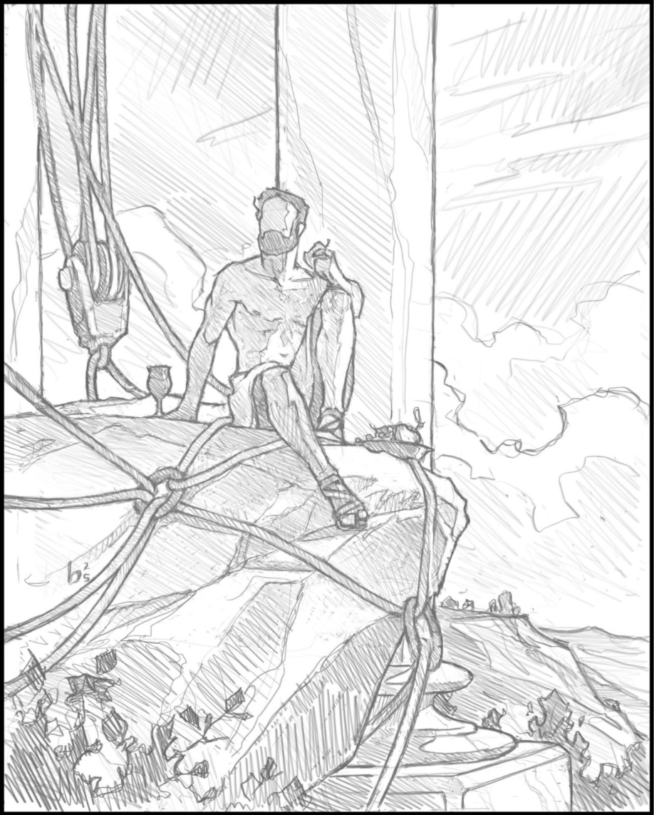 This sketch is much closer to what I wanted. You can see the slack in the ropes and easily imagine them under recent tension. It’s not as clear to me though that the effort is over. I like the addition of the columns in the background that imply some new project has been started, that Sisyphus has moved on from the boulder to other things.